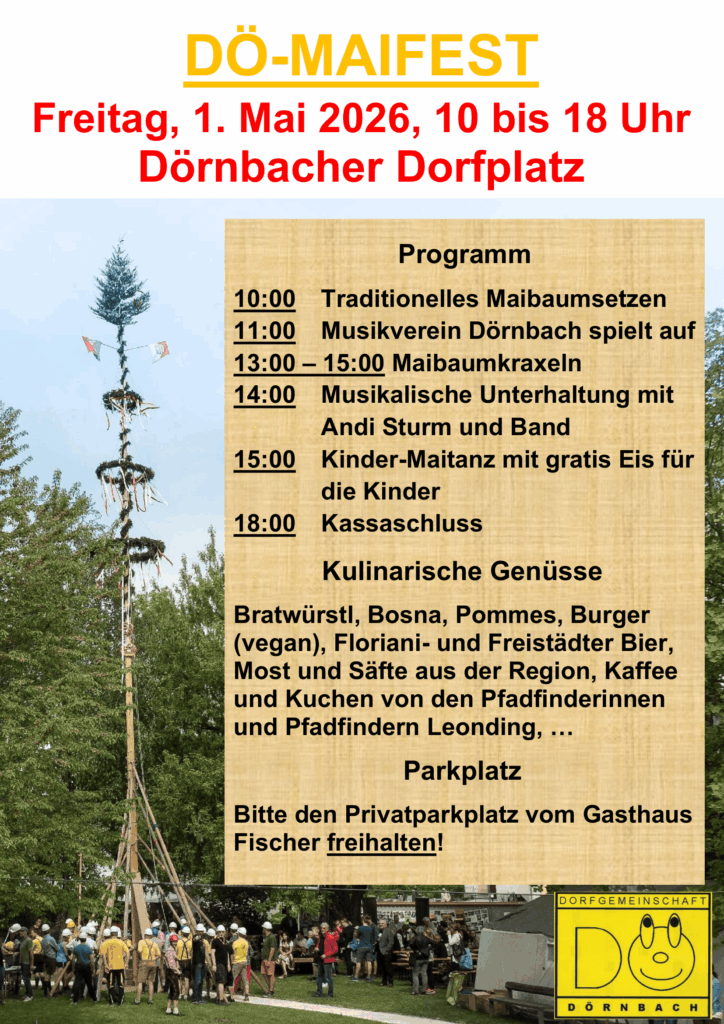 Das erwartet Euch: 💪 Traditionelles Maibaumsetzen mit Muskelkraft um 10 Uhr (wir brauchen viele starke Hände!) 🎶 Musikalische Unterhaltung mit dem Musikverein Dörnbach und Sturm Andi 🍽️ Kulinarische Köstlichkeiten mit regionalen Produkten – zum Beispiel das köstliche Bier vom Florianibräu Dörnbach 💃 Kindermaitanz mit einer süßen Belohnung 🍭